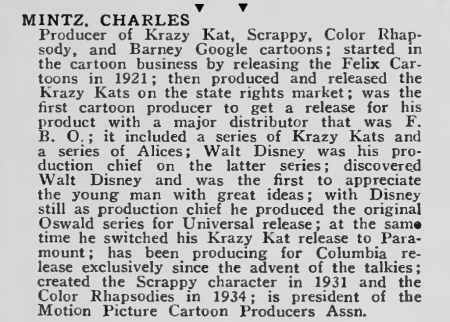 Here’s Charles Mintz’s entry in the biographical section of the 1937 Film Daily Product Guide and Director’s Annual. It speaks of the cartoon producer in the third person, but one suspects that it’s his official view of himself. And it’s fascinating.