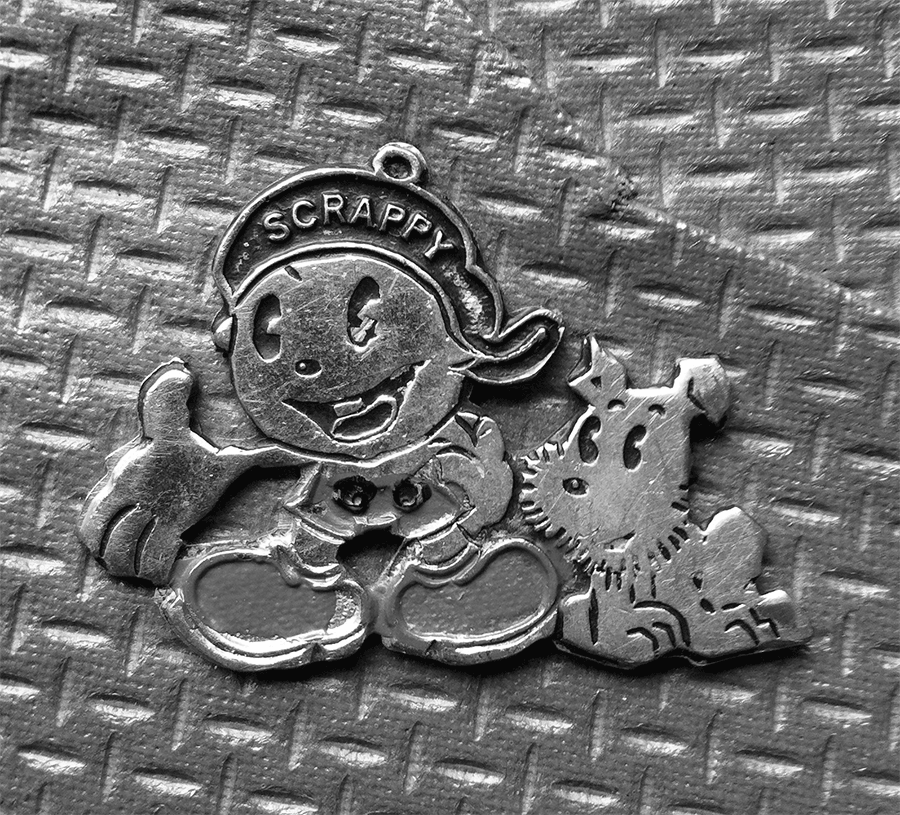 A reader recently sent some photos of a fine-looking Scrappy item which I not only don’t have but hadn’t seen before: a wallet emblazoned with a tiny metal portrait of him and Yippy.