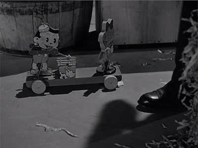 What to make of this? If this had been a 1930s Columbia flick, I’d accuse Harry Cohn of product placement. (I don’t know of any Scrappy appearances in live-action Columbia pictures, but the studio sure tried every other avenue to promote the guy.) But All Through the Night was a Warner film, made the year after the Scrappy series ended. So maybe the use of the Scrappy toy was random rather than an intentional promotional effort.